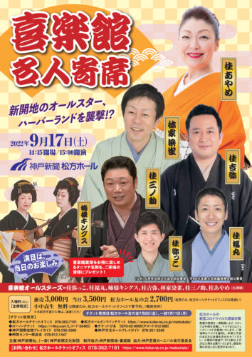 上方落語の定席「神戸新開地・喜楽館」と松方ホールのコラボ企画。喜楽館で活躍中の落語家が笑いを届けます。来場者には、喜楽館の昼席をお得に楽しめる「タニマチ名刺」をお配りします。