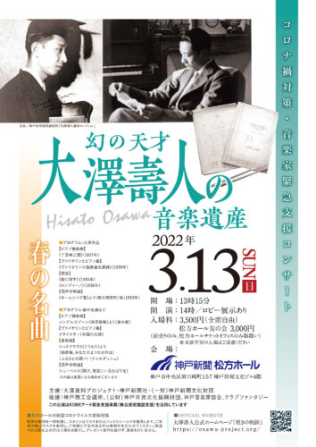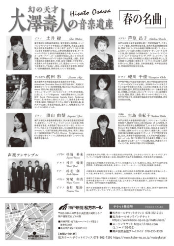 神戸出身で、戦前の欧米で自作を披露して高く評価されながら、若くして他界したため、幻の作曲家となっていた大澤壽人。大澤研究の第一人者・生島美紀子氏の企画で、春にちなんだ歌曲、室内楽などを集めました。