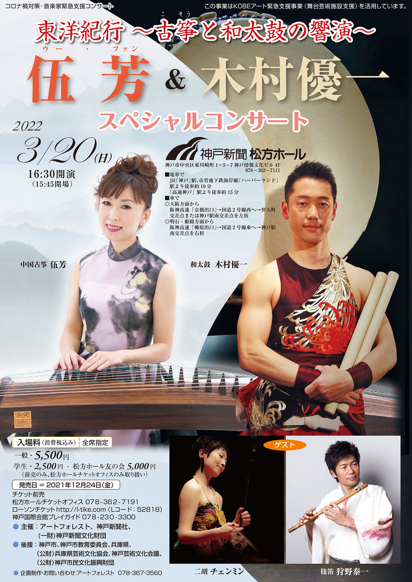 東洋紀行 ~古箏と和太鼓の響演~伍芳&木村優一スペシャルコンサート 神戸が誇る人気奏者、伍芳と木村優一の異ジャンル共演が、松方ホールで久々に実現。優美さと力強さを併せ持つステージをお楽しみに。 主催公演 クリックで拡大します 日時 2022年3月20日(日) 開場 15:45 開演 16:30 出演 伍芳(中国古箏) 木村優一(和太鼓) チェン・ミン(二胡) 狩野奏一(篠笛) 料金 全席指定 ¥5,500 学生¥2,500(前売のみ) 友の会¥5,000(前売のみ) お問い合わせ 松方ホールチケットオフィス 078-362-7191