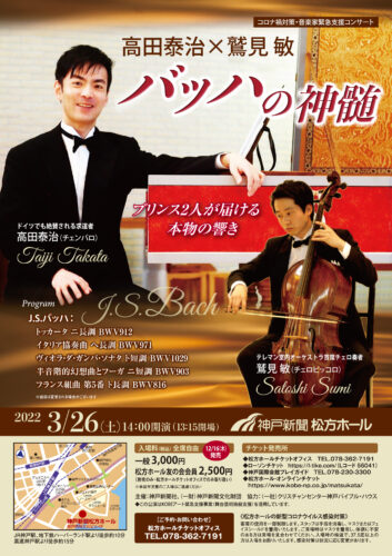 ドイツでも高く評価されている鍵盤楽器奏者・高田泰治とテレマン室内オーケストラ首席チェロ奏者の鷲見敏(すみ・さとし)による、オールバッハ・プログラム。荘厳さや愉悦感など、バッハの幅広く、奥深い世界を伝えます。