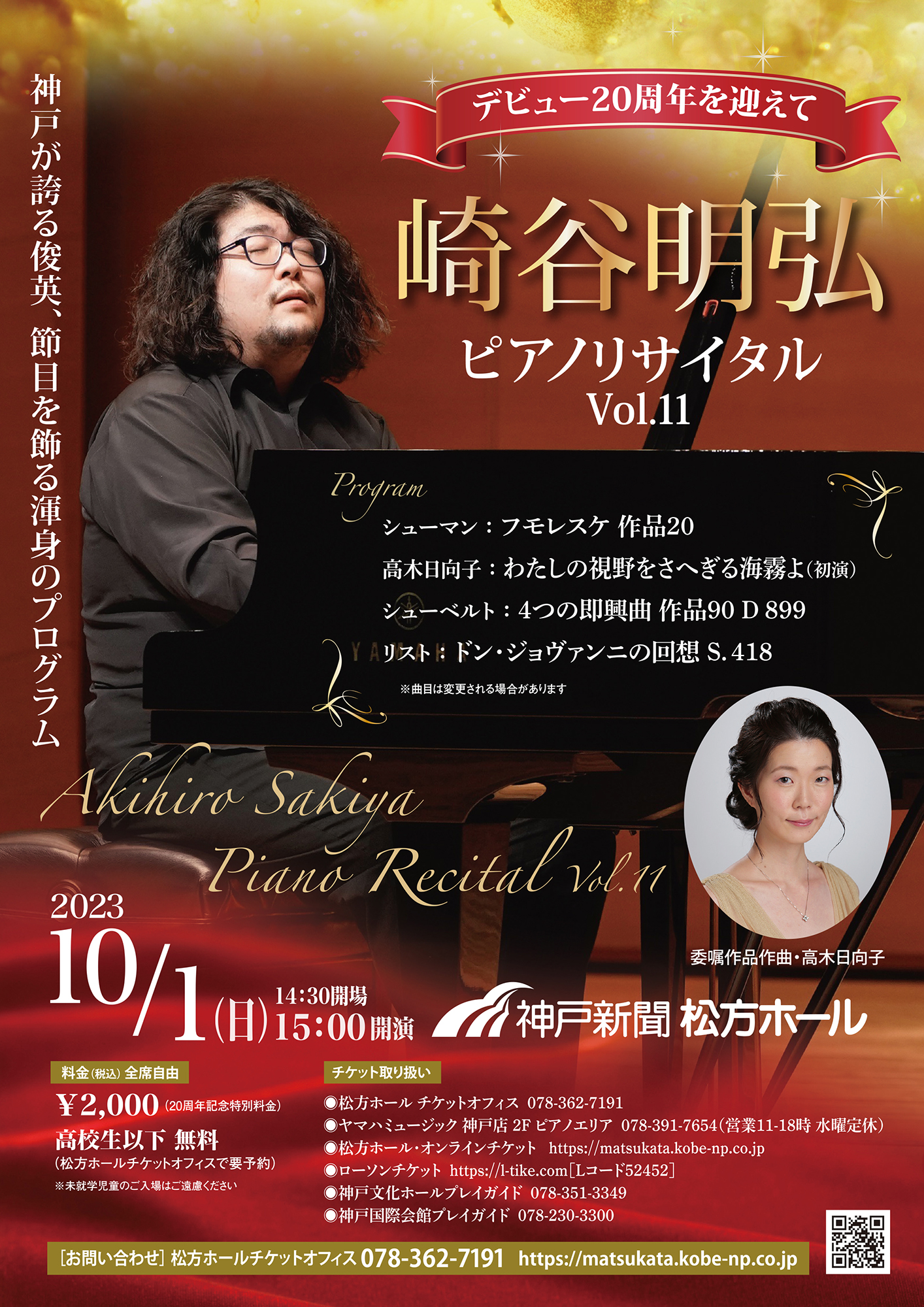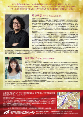 神戸を拠点に活躍中のピアニスト崎谷明弘が、松方ホールで11回目のリサイタル。デビュー20周年公演となる今回は、委嘱作品の初演、作品番号20に当たる曲などを取り上げ、チケット代を2000円にするなど、20周年にちなむさまざまな仕掛けを用意しています。