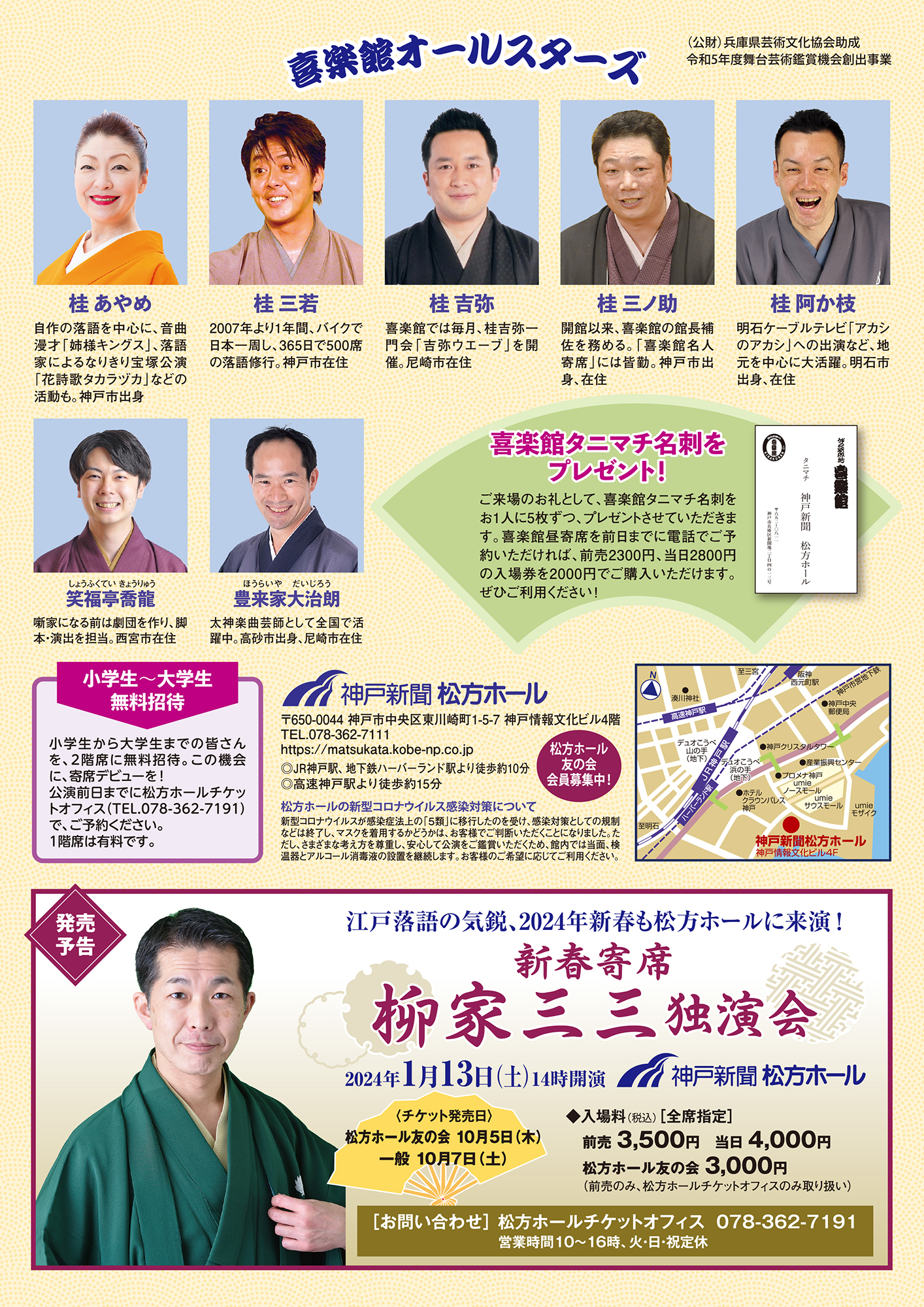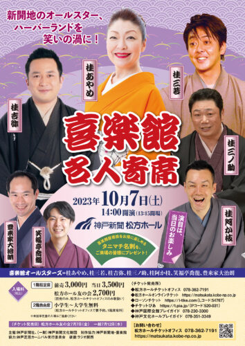 上方落語の定席「神戸新開地・喜楽館」で活躍中の落語家が笑いを届ける人気コラボ企画も、今回で3回目。桂あやめ、桂三若、桂吉弥ら、地元ゆかりの実力者が集結!