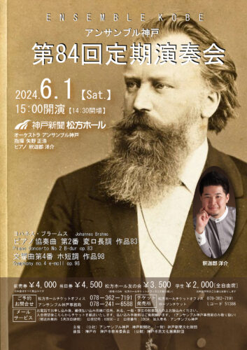 アンサンブル神戸 第84回定期演奏会 アンサンブル神戸の演奏会に、神戸を代表するピアニストの一人・釈迦郡洋介が初登場。得意とするブラームスの大曲に、渾身の気迫で挑みます。 主催公演 釈迦郡洋介 クリックで拡大します 日時 2024年6月1日(土) 開場 14:30 開演 15:00 出演 釈迦郡洋介(ピアノ)、矢野正浩(指揮) 曲目 ブラームス:ピアノ協奏曲第2番 変ロ長調、交響曲第4番ホ短調 料金 全席自由 前売 ¥4,000 当日¥4,500 学生 ¥2,000 友の会 ¥3,500 (前売のみ、松方ホールチケットオフィスでのみ取り扱い) お問い合わせ 松方ホールチケットオフィス 078-362-7191