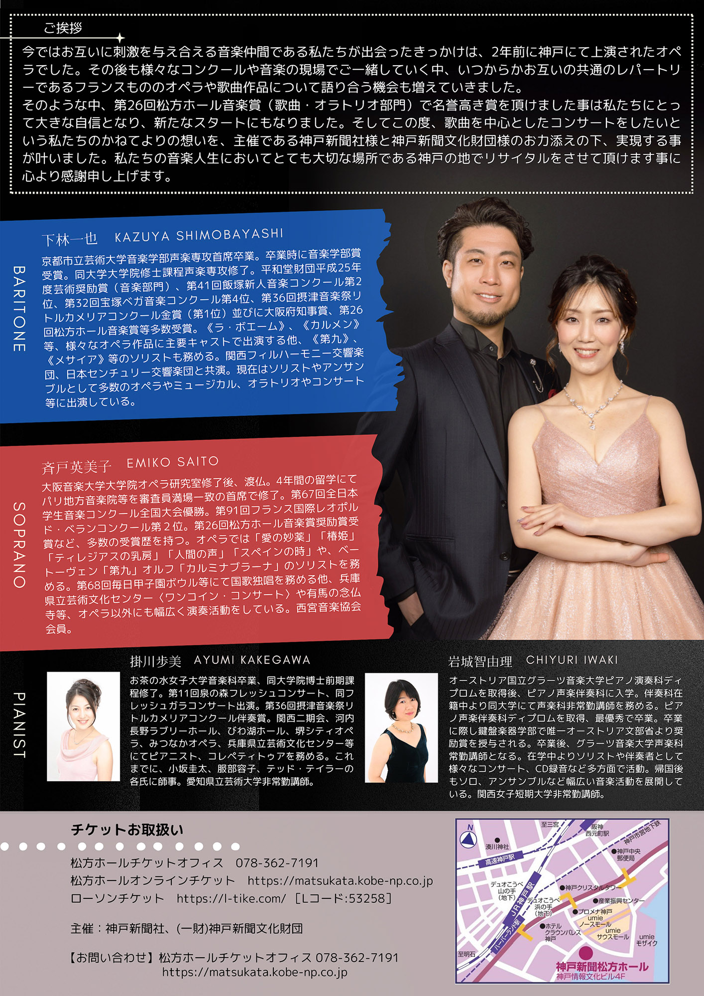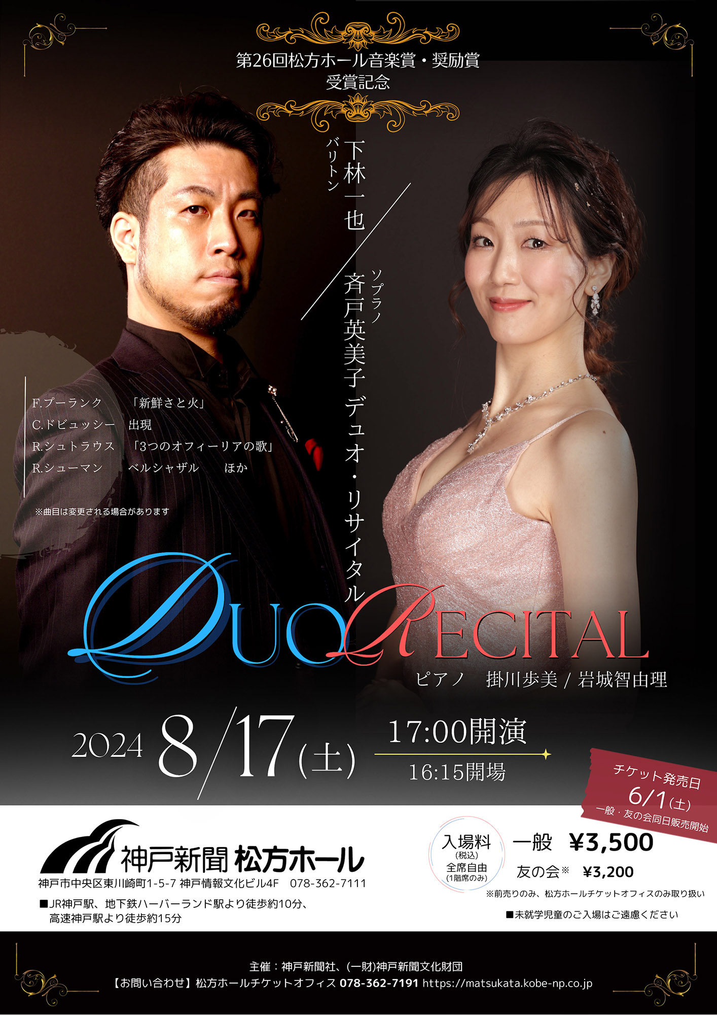 第26回松方ホール音楽賞を受賞した下林一也、同奨励賞を受賞した斉戸英美子による、受賞記念公演です。すでにオペラや宗教曲で活躍中の2人が、ともに得意とするフランス歌曲などを披露します。