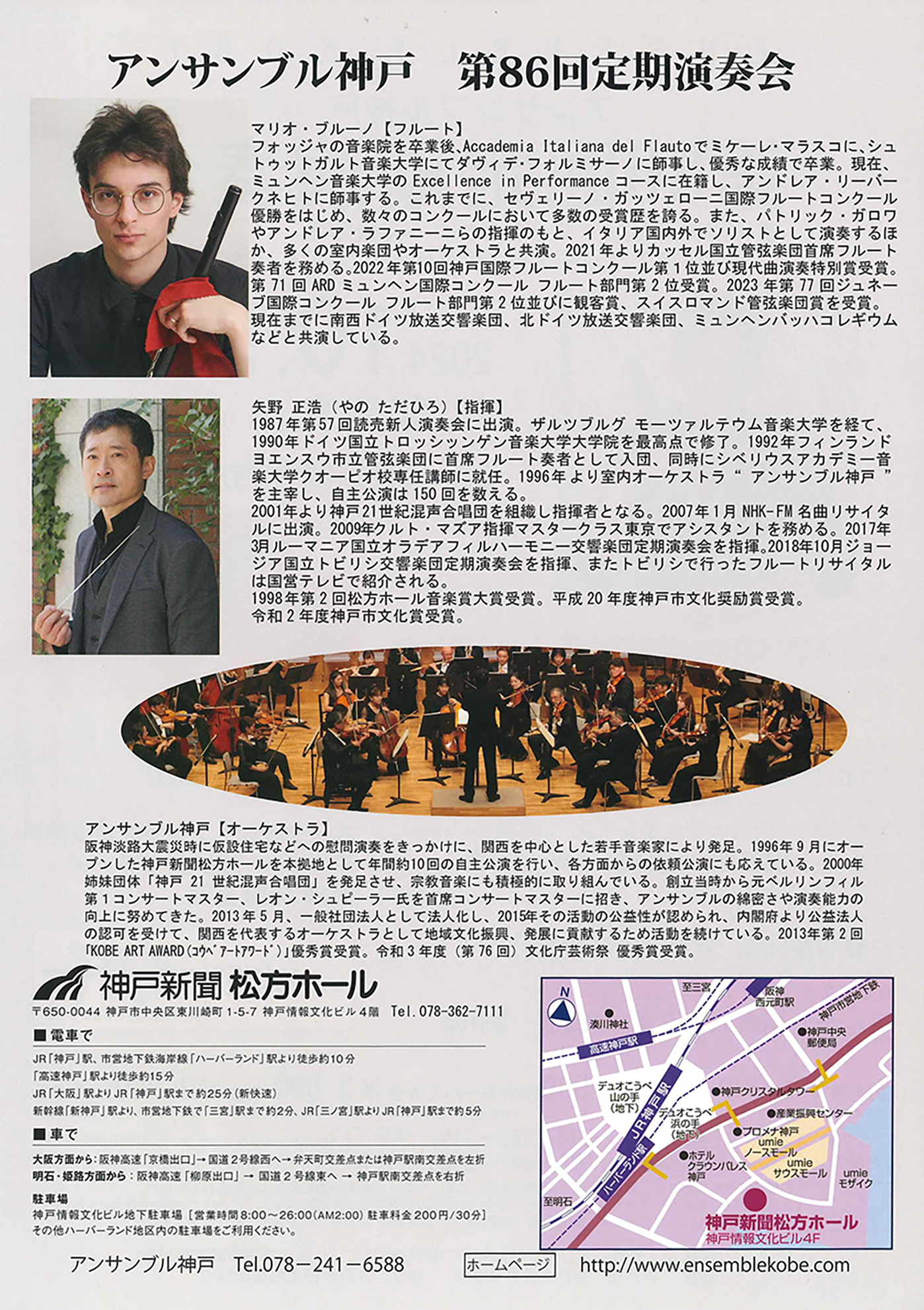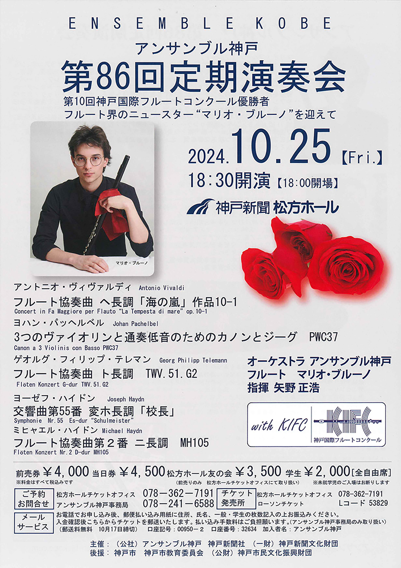 第10回神戸国際フルートコンクール優勝者(2022)、マリオ・ブルーノがアンサンブル神戸に初登場です。