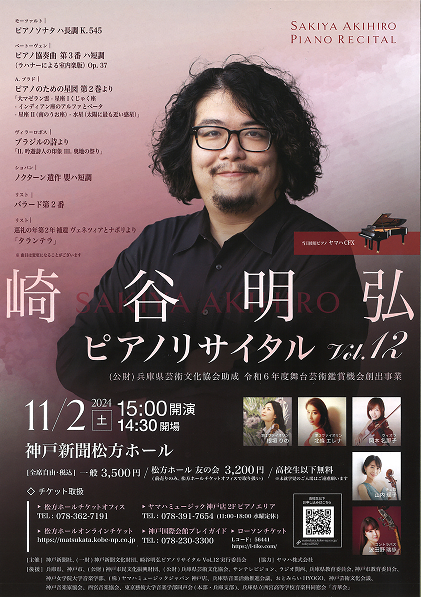 神戸出身で国内外のコンクールで上位入賞を重ねてきた崎谷明弘。現在も神戸を拠点に活躍を続けるピアノの駿才が今年も神戸新聞松方ホールで12回目のリサイタルを開催します。