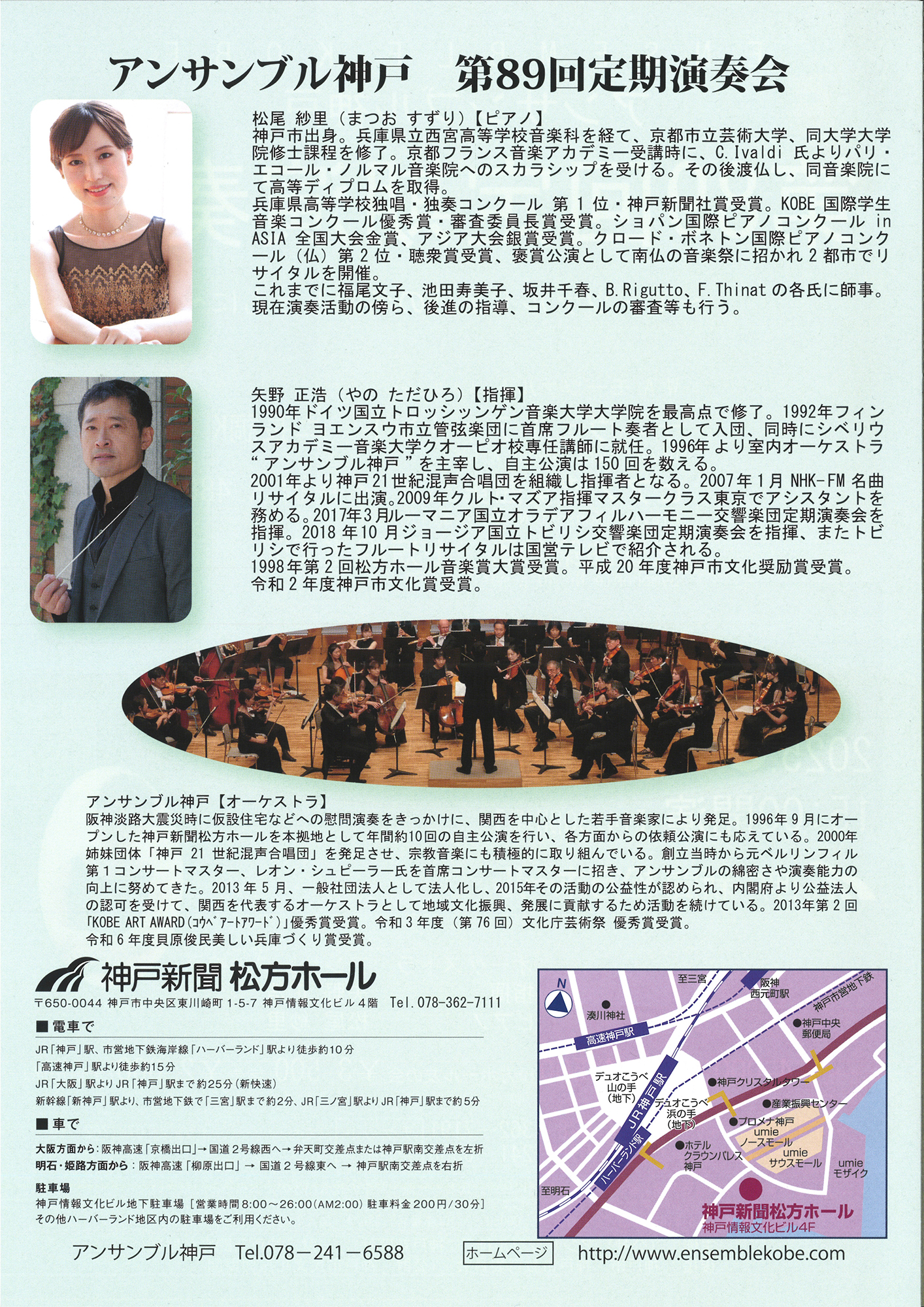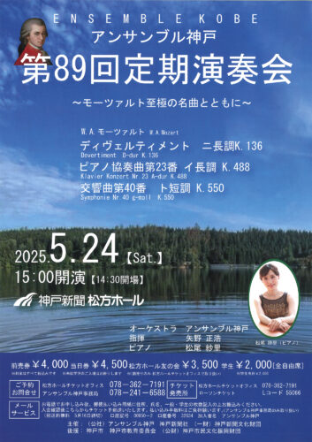 アンサンブル神戸 第89回定期演奏会 神戸市出身で現在、関西を中心に活躍する若手ピアニスト松尾紗里がモーツァルトを華麗に奏でます。 主催公演 松尾紗里 クリックで拡大します 日時 2025年5月24日(土) 開場 14:30 開演 15:00 出演 松尾紗里(ピアノ) 矢野正浩(指揮) 曲目 モーツァルト:ピアノ協奏曲第23番イ長調、交響曲第40番ト短調 第2稿 料金 全席自由 前売 ¥4,000 当日 ¥4,500 学生 ¥2,000 友の会 ¥3,500 (前売のみ、松方ホールチケットオフィスでのみ取り扱い) お問い合わせ 松方ホールチケットオフィス 078-362-7191