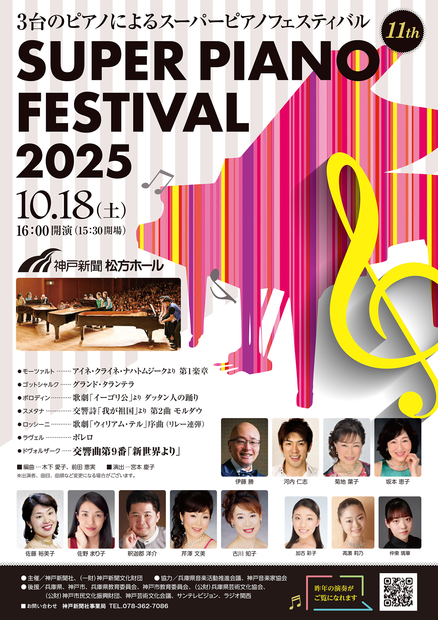 神戸ゆかりの実力派9人に気鋭の3人。総勢12人のピアニストによるホール所有のフルコンサートピアノ3台を駆使した圧倒的な音の響きとパフォーマンスをお楽しみください。