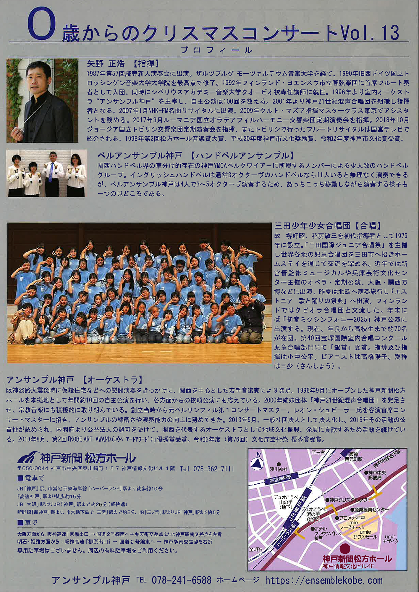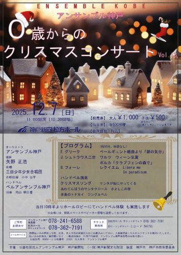 アンサンブル神戸 0歳からのクリスマスコンサート Vol.13 主催公演 三田少年少女合唱団 クリックで拡大します 日時 2025年12月7日(日) 開場 10:30 開演 11:00 出演 矢野正浩(指揮) 三田少年少女合唱団 ベルアンサンブル神戸(ハンドベル) 曲目 J.シュトラウス2世:ワルツ ウィーン気質、クリスマスソング ほか 料金 全席自由 前売:大人 ¥1,000 子ども(高校生以下)¥500(0歳から要チケット) 当日:各¥500増 ※会員割引はございません お問い合わせ アンサンブル神戸事務局 078-241-6588
