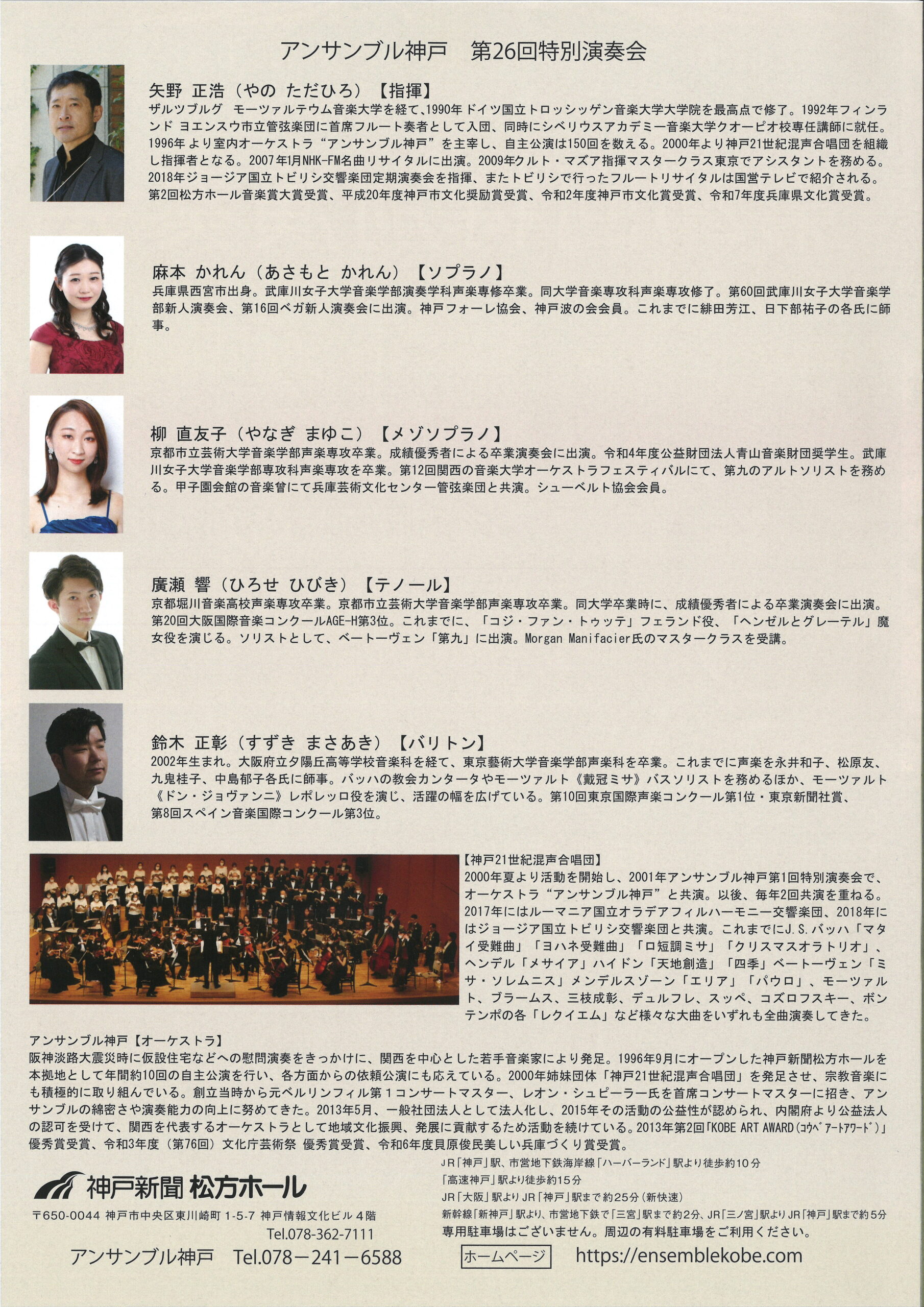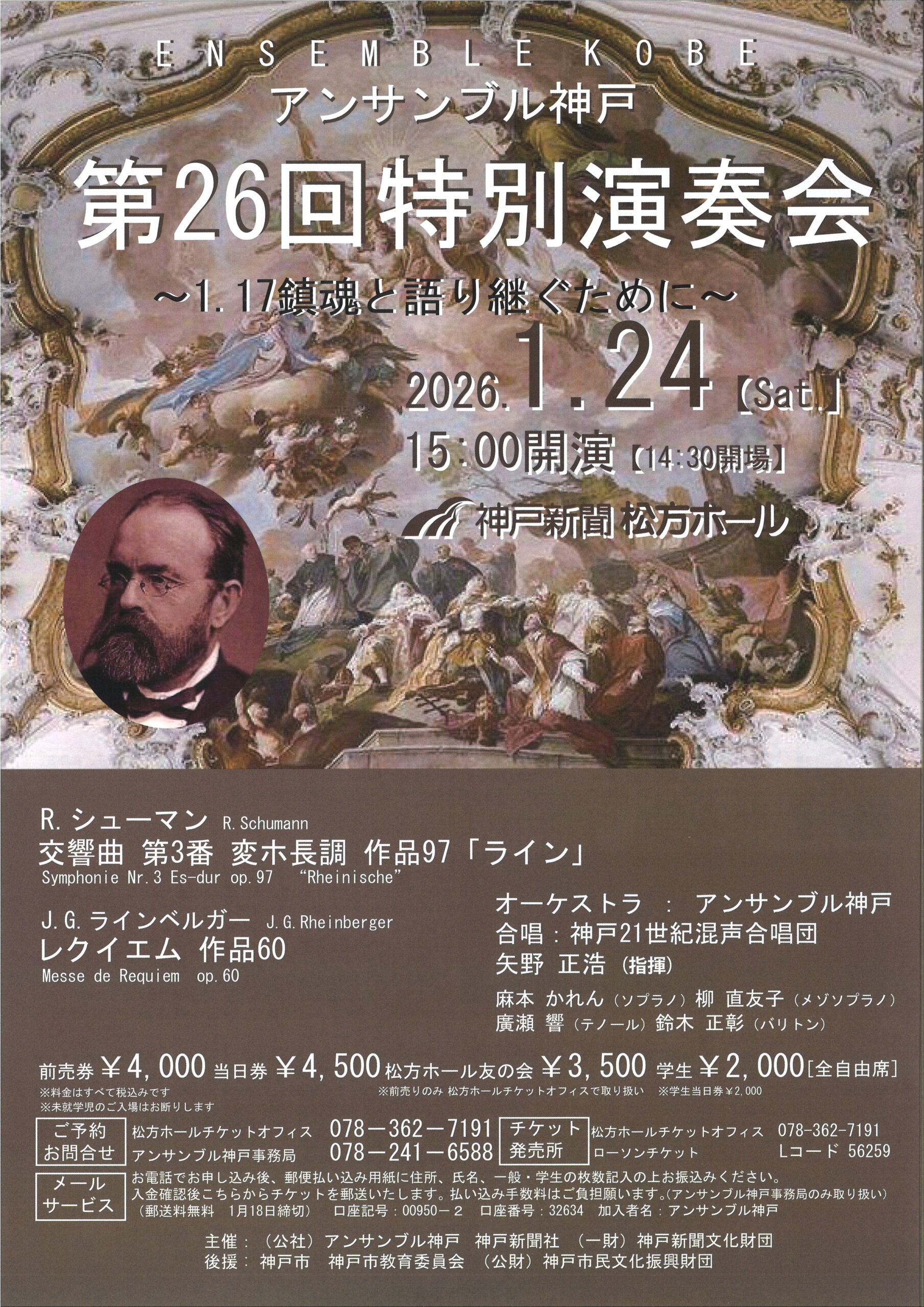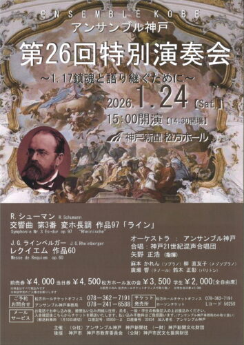 アンサンブル神戸 第26回特別演奏会~1.17鎮魂と語り継ぐために~ 主催公演 矢野正浩 クリックで拡大します 日時 2026年1月24日(土) 開場 14:30 開演 15:00 出演 矢野正浩(指揮) 神戸21世紀混声合唱団 ほか 曲目 ラインベルガー:レクイエムOp.60 ほか 料金 全席自由 前売 ¥4,000 当日¥4,500 学生 ¥2,000 友の会 ¥3,500 (前売のみ、松方ホールチケットオフィスでのみ取り扱い) お問い合わせ アンサンブル神戸事務局 078-241-6588