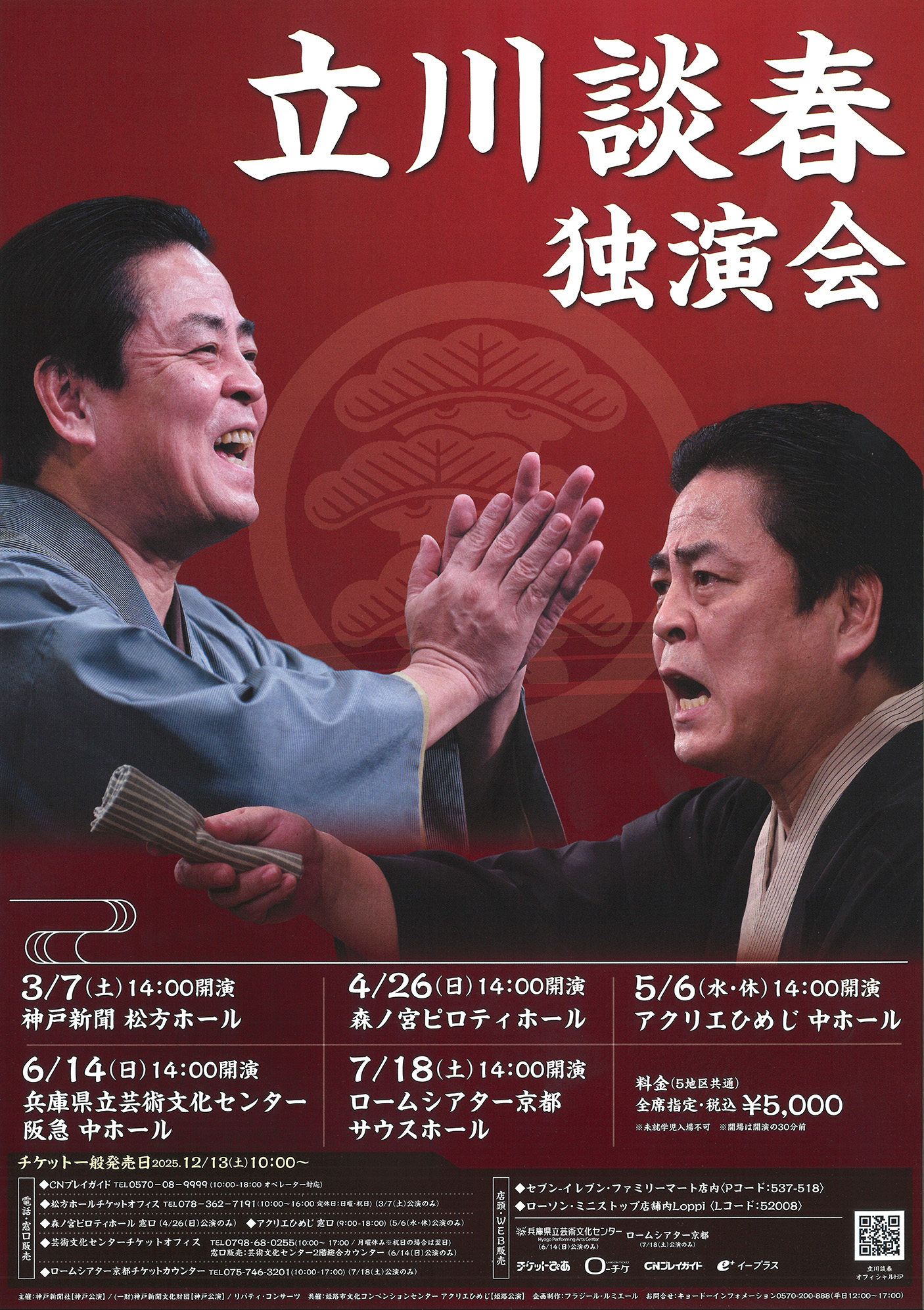 立川談春 独演会 主催公演 クリックで拡大します 日時 2026年3月7日(土) 開場 13:30 開演 14:00 出演 立川談春 料金 全席指定 ¥5,000 ※会員割引はございません お問い合わせ キョードーインフォメーション 0570-200-888(平日12:00~17:00)