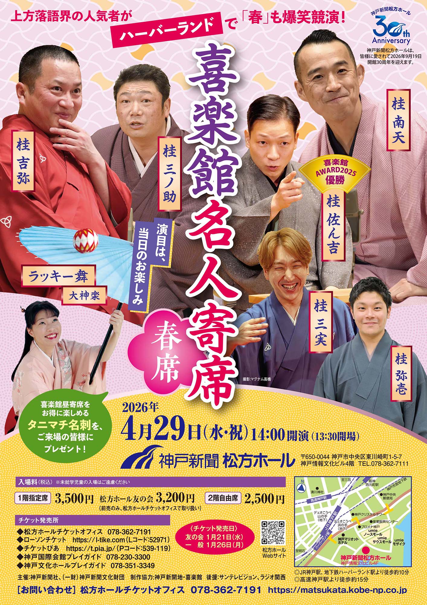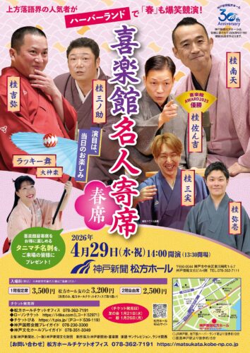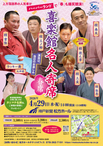 昨年に続き、春席の開催が決定です。上方落語界で観たい、聴きたい噺家さんが、この春もハーバーランドで爆笑競演!ご来場の皆さまには、喜楽館の昼席をお得に楽しめる「タニマチ名刺」をプレゼント。
