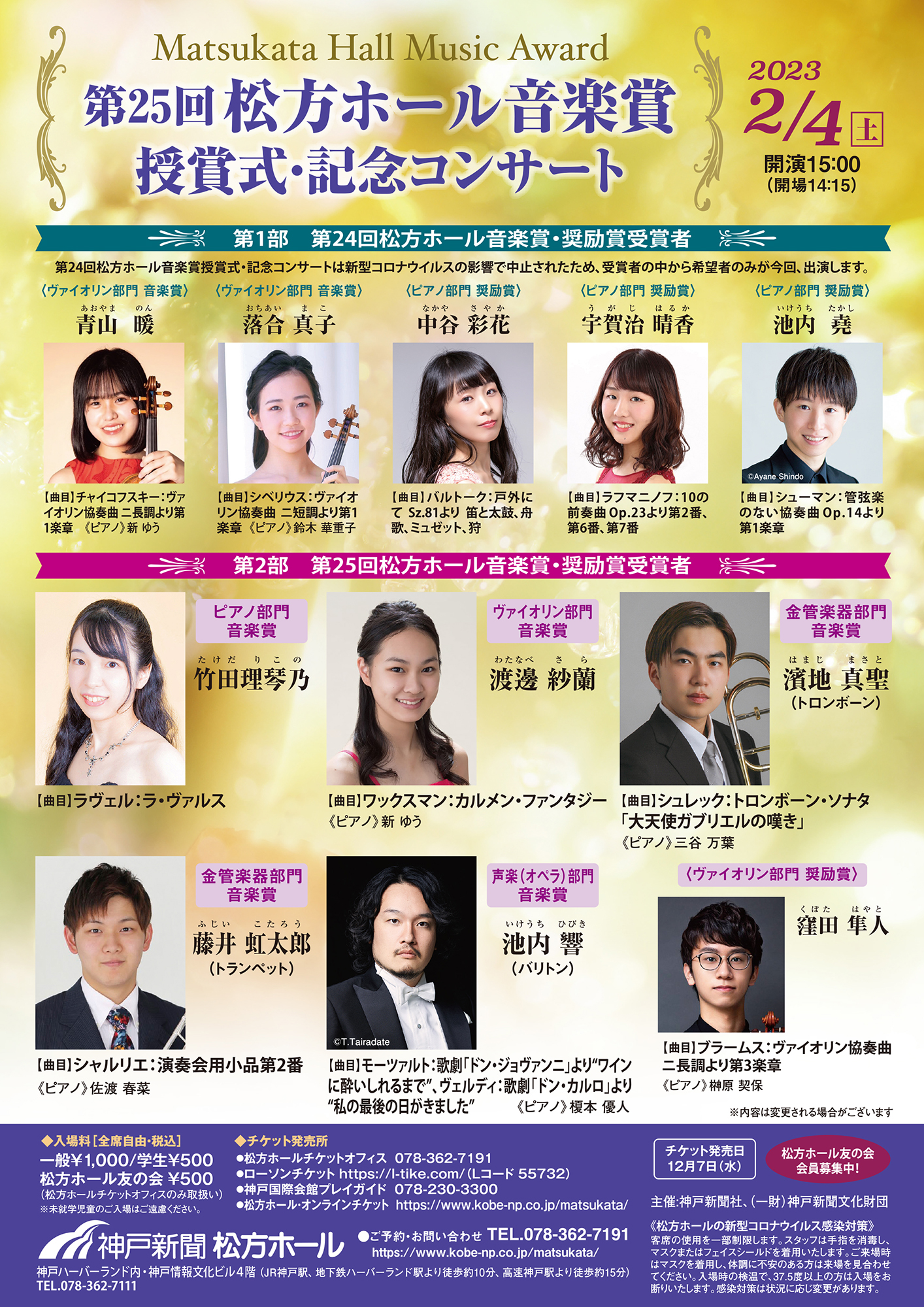 クラシック音楽の優れた才能を発掘・顕彰する第25回松方ホール音楽賞・奨励賞の受賞者計6人をお披露目。前回の記念コンサートをコロナ禍で中止したため、第24回の受賞者の内、希望者5人も出演し、計11人の豪華なステージとなります。